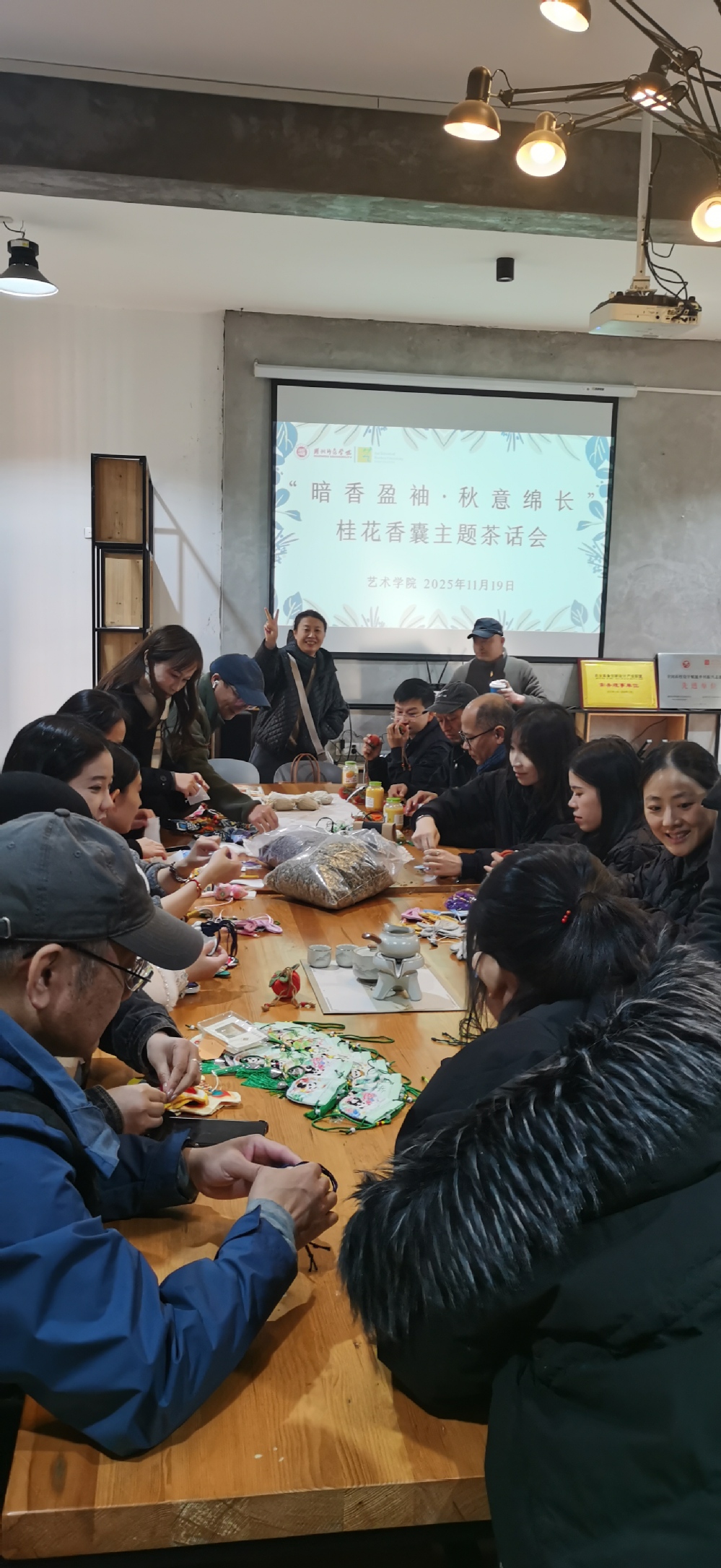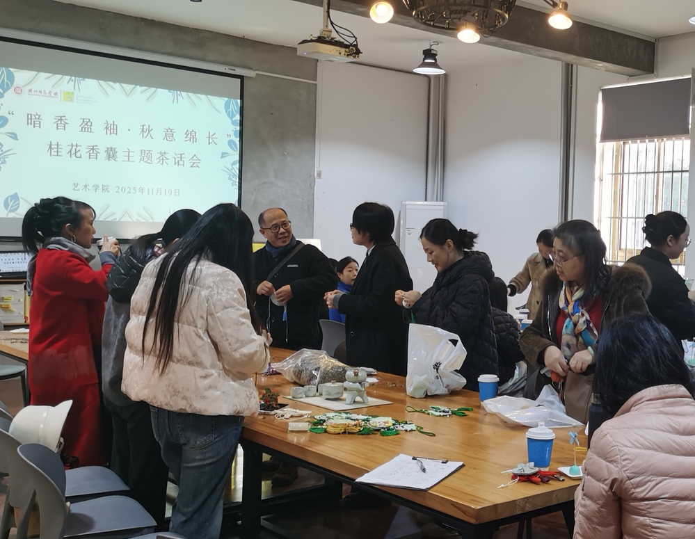 11月19日下午,艺术学院分工会主办的“暗香盈袖·秋意绵长”香囊手作茶话会在教师发展中心15-203室举行。活动以花为媒、香囊为载,邀请全院教职工共赴一场秋韵与艺术交织的沉浸式体验。